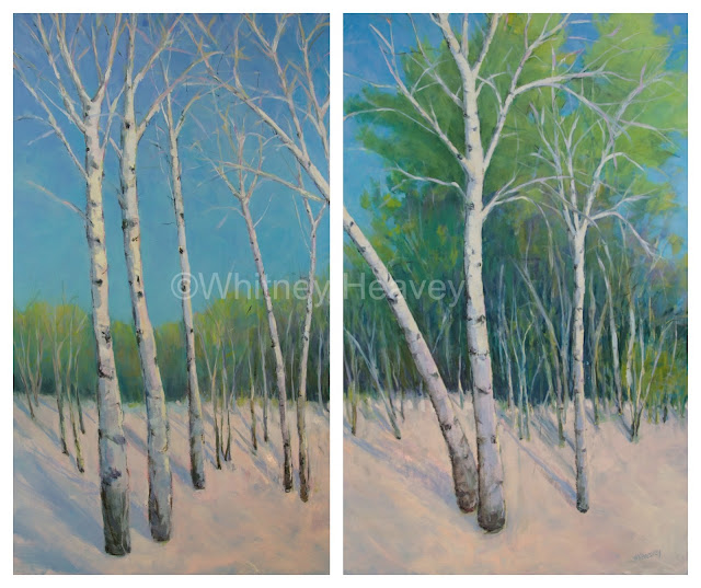 This large contemporary painting of birch trees was a large commission I did a few years ago. Each panel is 36"x60". The art collector was someone who has bought my work in the past and had moved to a large house. She loved birch trees and had a very large wall in her foyer next to her staircase. I met with her in her home and we came up with a plan including the size of the panels. A large contemporary painting of birch trees would be a perfect addition to her new home! I was really excited as I have been wanting to paint birches for awhile. It's hard not to notice them when you live in New England, especially when they stand out in the winter against the gray backdrop of the other trees. When I was at the collector's home we were admiring her view of birches from her living room and it was late day and the light was pink glow. Spring was just around the corner so their were peeks of greens and as well as red budding trees. I went back to my studio and immediately did some studies while the image was fresh in my head (I hate relying just on a photo as it can lose so much information).